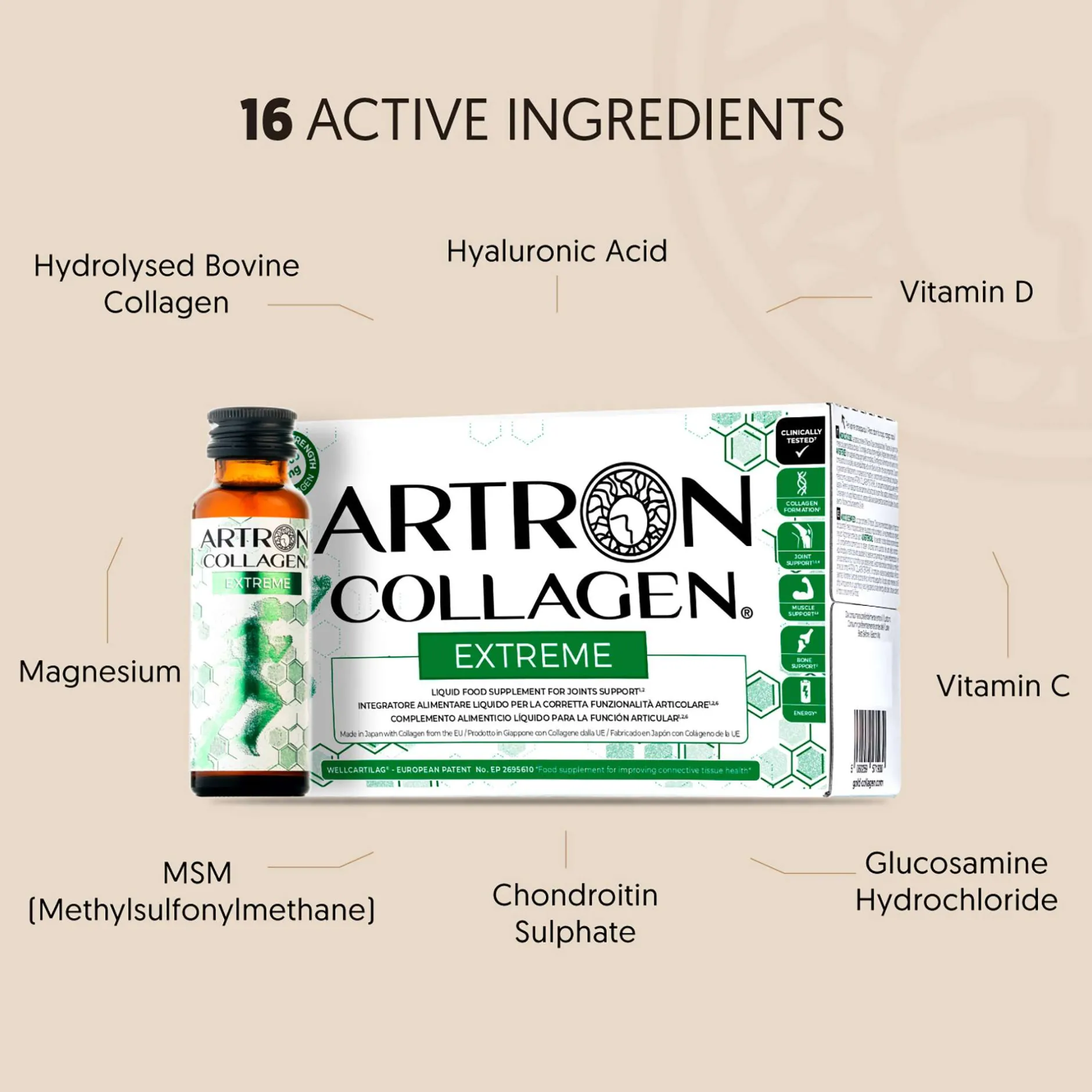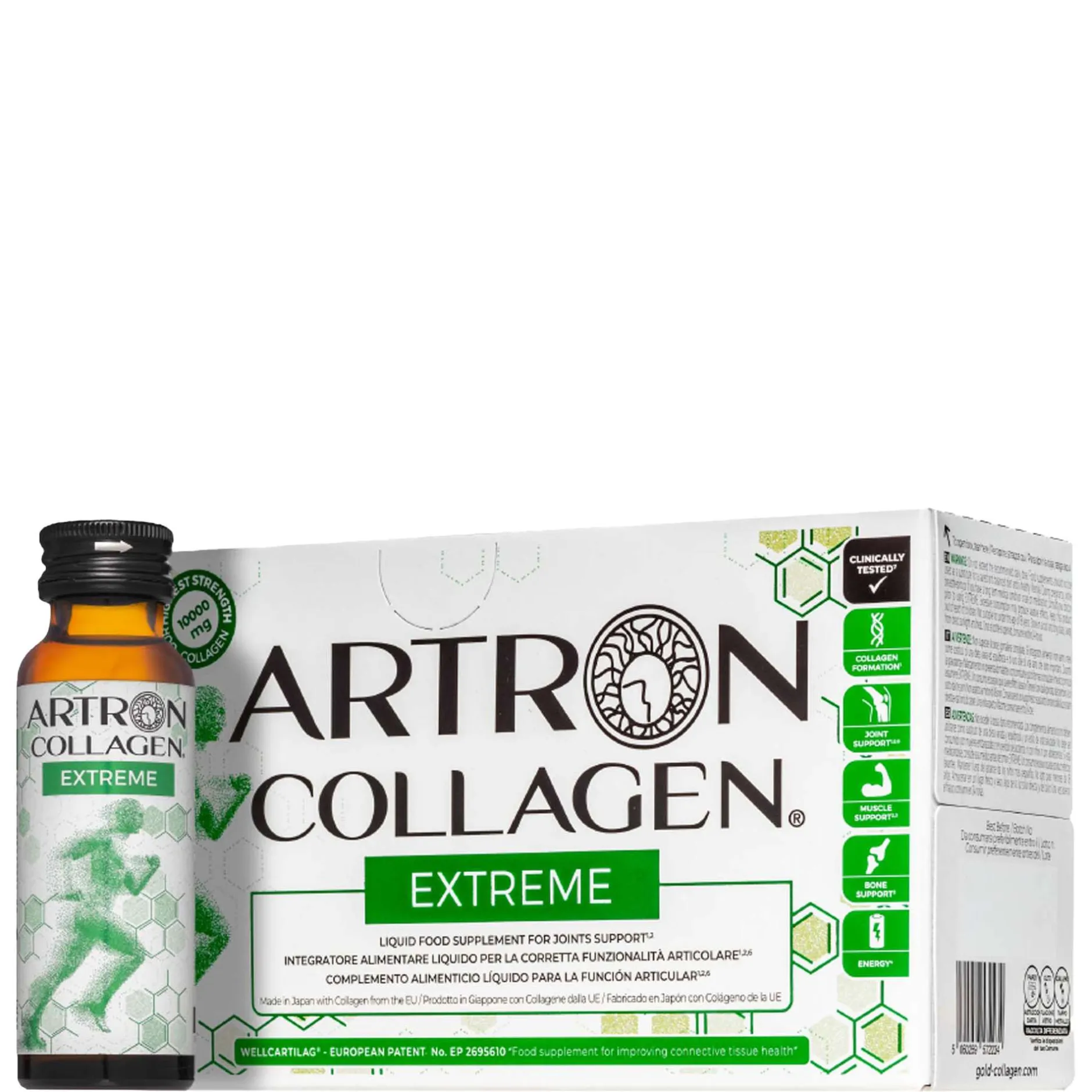 ARTRON COLLAGEN® EXTREME helps to support your joints, cartilage and bones. Developed by research scientists and nutrition experts using advanced patent WELLCARTILAG® Complex of Bioactive Collagen Peptides, Hyaluronic Acid, Glucosamine, Maca, Black Pepper Extract and L-Carnitine, in combination with MSM, Chondroitin, Ginger, Vitamins and Minerals for optimum absorption and bioavailability.